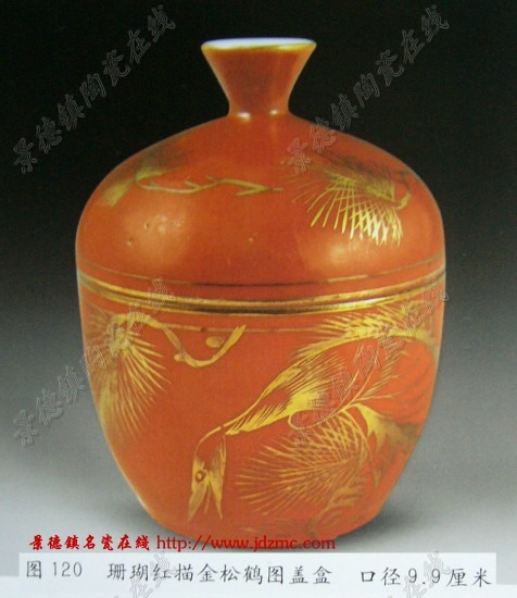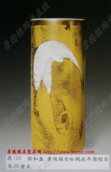 图122为黄地描金松鹤延年图帽筒,虽画工较上器略细,但夸张的造型有过之而无不及,绘画技法全无,底红彩“江西景镇,熊和盛裕,珍品名窑”。从画工来讲,毫无珍品之实。胎釉质量中下,亦不入名窑之列,故民国时期中低档用瓷的绘画水平不高之说不虚。