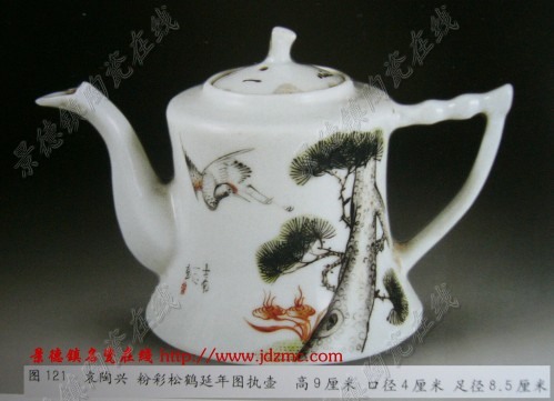 图121为1945年粉彩松鹤延年图执壶,外壁一侧绘一挺拔的松树,树干以墨彩勾廓,线条平直,以墨彩圈点鳞状树皮,技法平庸。松针墨线硬直。所罩青绿过于浅淡,缺少茂密之感。树下以红彩画灵芝,造型夸张。一只飞鹤俯冲而下,墨彩勾点,头染红彩,姿态僵硬。背面墨书“松鹤精神。乙酉年江西袁陶兴写”。底红彩“江西袁发兴出品”印章款。从此器胎质来看,较为细腻,成型工艺较好,非市面上低档生活用瓷,但画法粗劣。由此可知,民国时期一般市民阶层所用中低档器物之绘画水平。