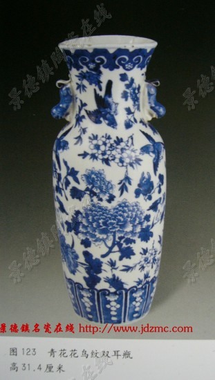 如图123青花花鸟纹双耳瓶,纹饰繁缛,青花色泽艳紫,纹饰画工粗糙。虽底书“康熙年制”款识,但与康瓷毫不相干,此为民国时期最低档的饰以花鸟纹的器物代表。