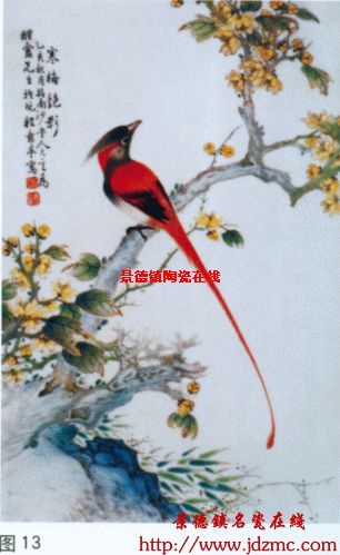 早在六十年代初期,“珠山八友”中的唯一健在者--花鸟画家刘雨岑老先生,向我作了很好的介绍。他以自己独创的“水点桃花”为例,说作宣纸画点花头,是连红带粉点,在瓷器上混合点就不行,得先打一层玻璃白底子,再用红去点,粉在下,红在上以水洗开,色彩就鲜艳。否则,就不理想,就不成功。总之,看起来很简单,要想摸索成功的确不容易,不经过几番探索,就无法达到独特的艺术效果。他独创的黑叶描绘“牡丹”和“秀球”,画在瓷盘里,曾参加十六国展出。“珠山八友”中画花鸟的,还有程意亭老先生。他对于宣纸画,特别是瓷上画面颜料的漂研制作,有深厚的研究,积累了丰富的经验。他作的花鸟画,不仅设色相当丰富,秀丽古雅,而且兼有豪壮和柔美的格调。当然,“珠山八友”中专攻画梅的,只有田鹤仙先生一人。他画的《梅花弄影》更是师无前承,迥然一格,引人入胜。徐仲南老先生常用胭脂红在瓷上画竹,笔调和色彩都与众不同,给人们带来了强烈的装饰感。汪野亭老先生,最初在瓷上画山水画,采用胶水料性绘法,后来,他感到这种绘法不足以表现自己的创作理想而改用油料,亦以水粉敷色,别具一格。首创瓷板人物肖相画的邓碧珊老先生,虽然影响不及自己擅长画鱼,但到后来,他扩大了自己的首创成果,进一步作出贡献的又有了自己的弟子——王琦画家。