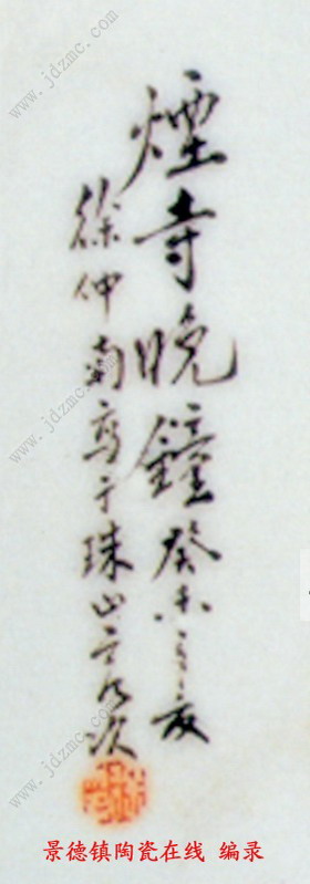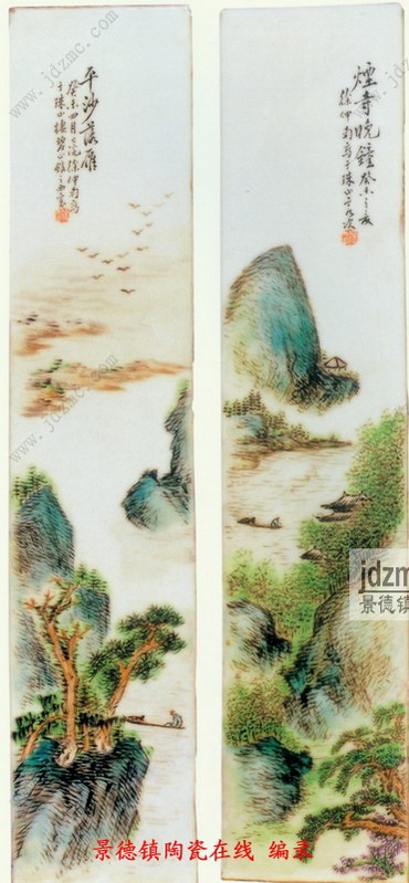 粉彩潇湘八景图之一、二徐仲南高40厘米、宽8.2厘米题款:“平沙落雁。癸未(1943)四月上浣,徐仲南写于珠山楼碧山馆之西窗。”印章:“徐印”。“烟寺晚钟。癸来(1943)之夏,徐仲南写于珠山客次。”印章:“徐印”。本资料来源于景德镇陶瓷馆馆藏作品资料,真实可信。