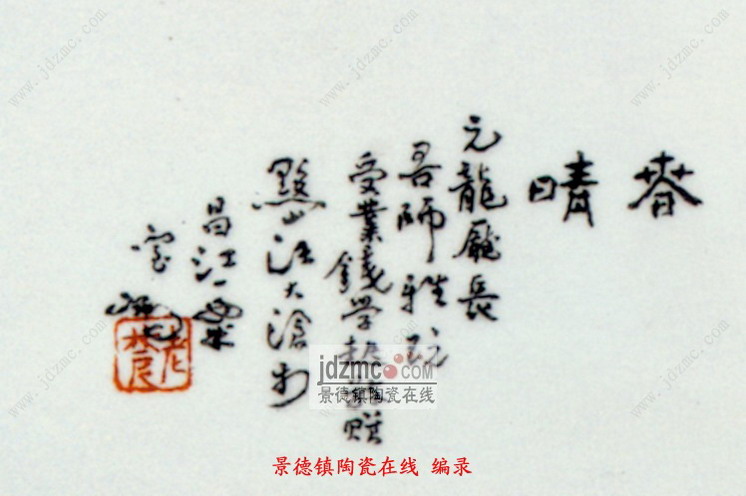 粉彩春晴图瓷板汪大沧长40厘米、宽27厘米题款:“春晴。元龙厅长吾师雅玩,受业钱学起敬赠,黟山汪大沧于昌江一粟室。”印章:“老衣”。景德镇陶瓷馆馆藏资料 真实可信