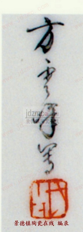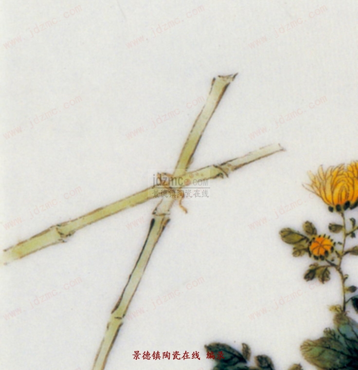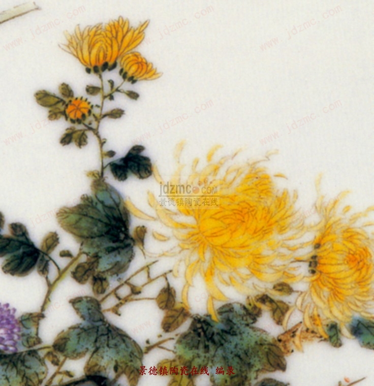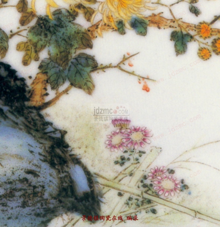 粉彩东篱佳色图瓷板方云峰长25.5厘米、宽18厘米题款:“压遍群芳。庚辰(1940)年夏月方云峰写。”印章:“方氏”。景德镇陶瓷馆馆藏资料 真实可信