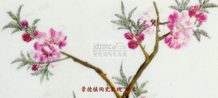 粉彩桃花鹦鹉图瓷板邹文侯长38厘米、宽24.5厘米题款:“深院无人草树光,娇莺不语趁阴藏。等闲弄水浮花片,流出门前赚阮郎。邹文侯敬绘于昌江。”印章:“文侯”、“书画”。“写椒石意”。景德镇陶瓷馆馆藏资料 真实可信