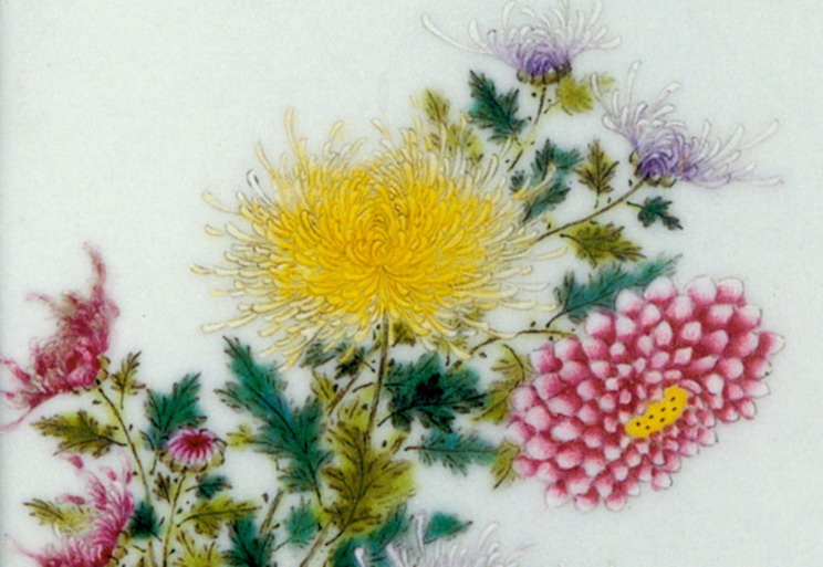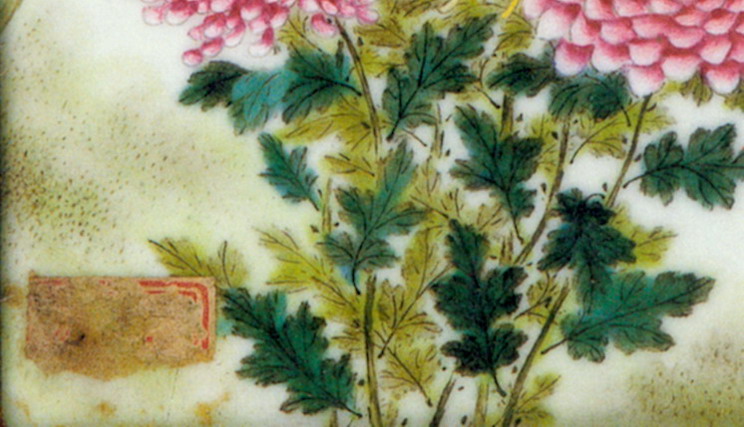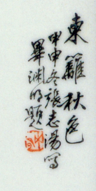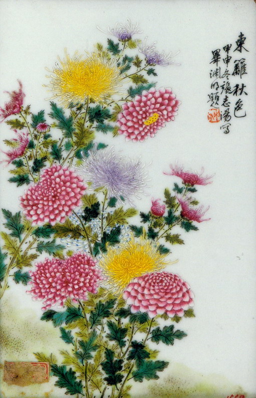 粉彩东篱秋色图瓷板张志汤长20厘米、宽12.6厘米题款:“东篱秋色。甲申(1944)冬,张志汤写,毕渊明题。”印章:“渊明”。景德镇陶瓷馆 馆藏作品资料 真实可信