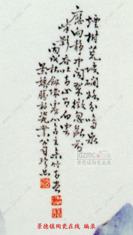 粉彩层峦迭翠图瓷板余竹青长8l厘米。宽21厘米题款:“烟树荒墟涧路分,鸣泉应向静中闻。翠微忽断前嶂影,吞吐青山有白云。丙戌(1946)秋,剑城虚心舍主余竹青画。景德镇胜利瓷业公司珍品。”印章:“什青”、“余印”、“公司”。景德镇陶瓷馆 馆藏资料 真实可信