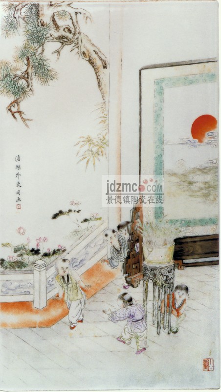 粉彩婴戏图瓷板潘匋宇长45厘米、宽25.5厘米题款:“淡湖外史匋画。”印章:“鼎”、“古欢”。景德镇陶瓷馆 馆藏资料 真实可信