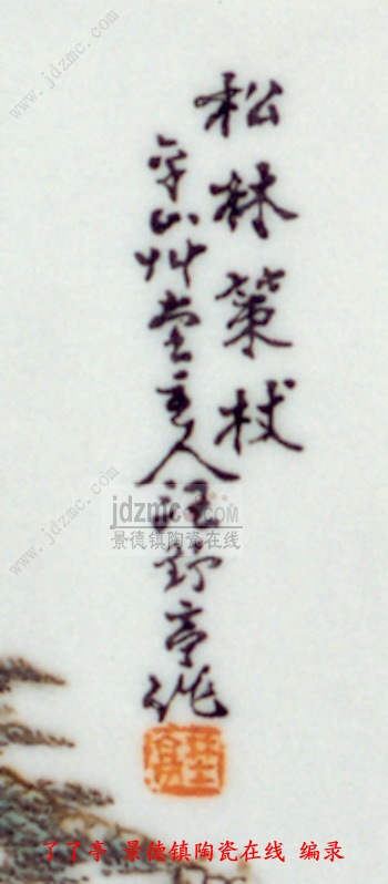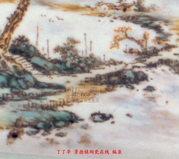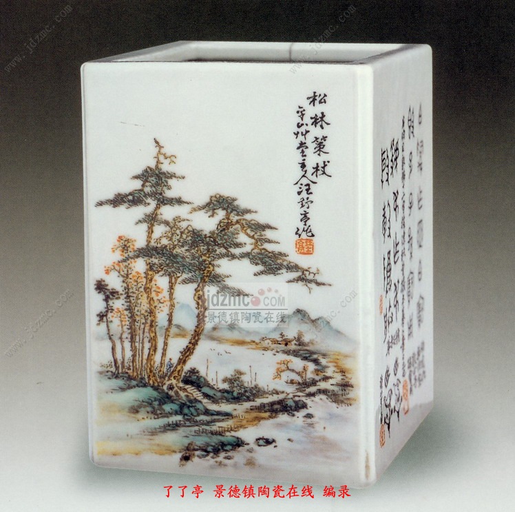 这只四方笔筒两面作画,两面书写金文。作画的一面正中口沿上微有裂纹,此为另一画面。图左下方一座山脚,陂陀上几株高大的松杂傲然挺立,下方一条小径从树下斜坡上由西向东伸展,然后画个半圆由南而北。再沿着北对岸山脚复向西去。南北两岸之间为一条小河,河西至河东之间又被一条长堤隔开,堤岸中段一座小桥,河西溪水穿过小桥注入河东。西南端山脚斜坡上一位高士策杖立于松下石径上,眺望河对岸山脚下的村舍。村舍后上方起伏重叠的山峦横亘东西。
