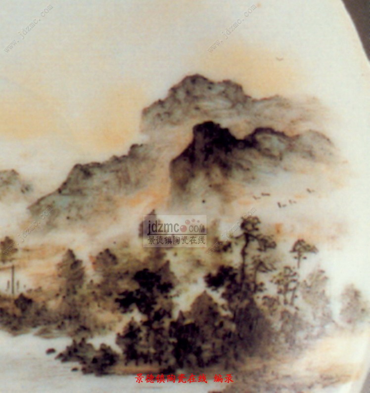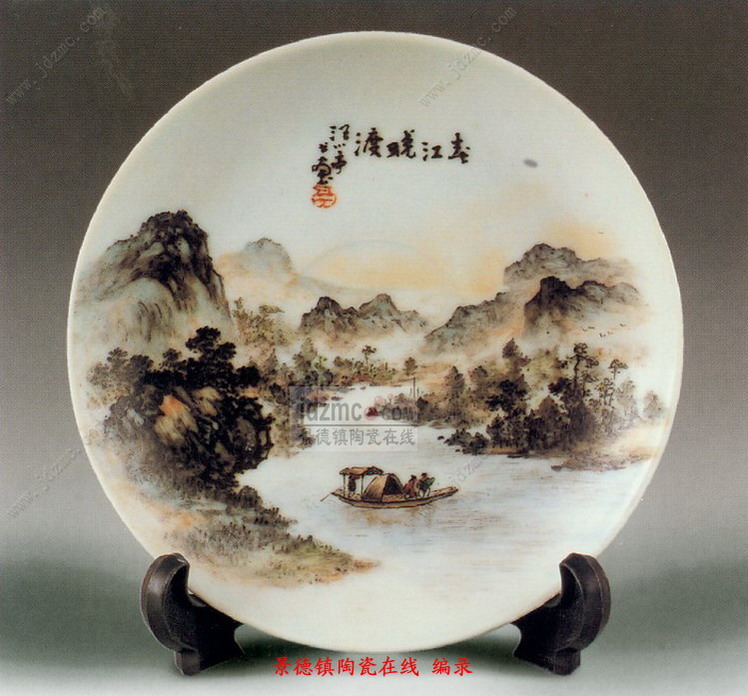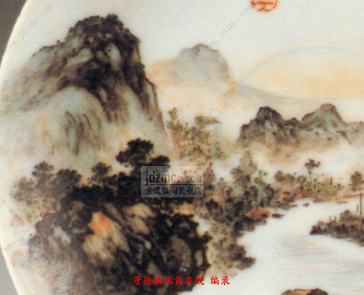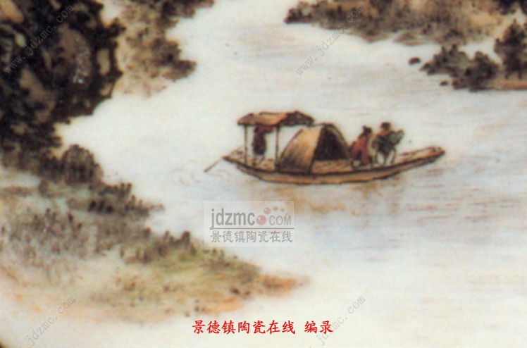 此盘画的是春景,碟子上的画面的中心为一条溪涧, 涧水西流复东, 呈“之”字形。河水清且涟漪。河的中央一条船正咿呀东渡,划破晨空的宁静,惊飞了一群宿鸟。天空,已是“曙色才浸蘸晕霞”。晓喻一个美好春天的早晨已经到来。船头, 已坐上了两位黎明即起的老农,他们在兴致勃勃地谈东论西。右边的一位面南,在指指点点说得有声有色,左边一位侧坐面西,则听得津津有味。小河两岸林木茂密,郁郁葱葱。正北面云轻峰秀, 山峦重叠,起伏绵延,似无数龙蛇飞舞,处处呈显出一派蓬勃的生机。这便是江南春季的良辰美景。