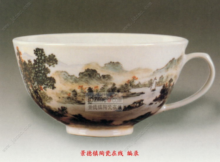 这套茶具是用他自创的一种新彩绘制的,这种新彩类似浅绛彩,但比浅绛色略丰富。