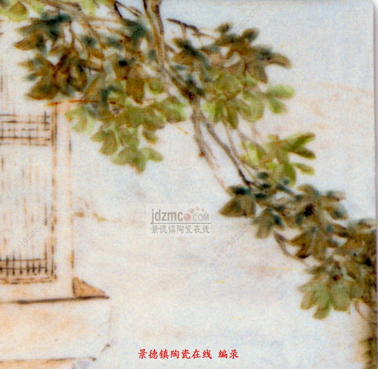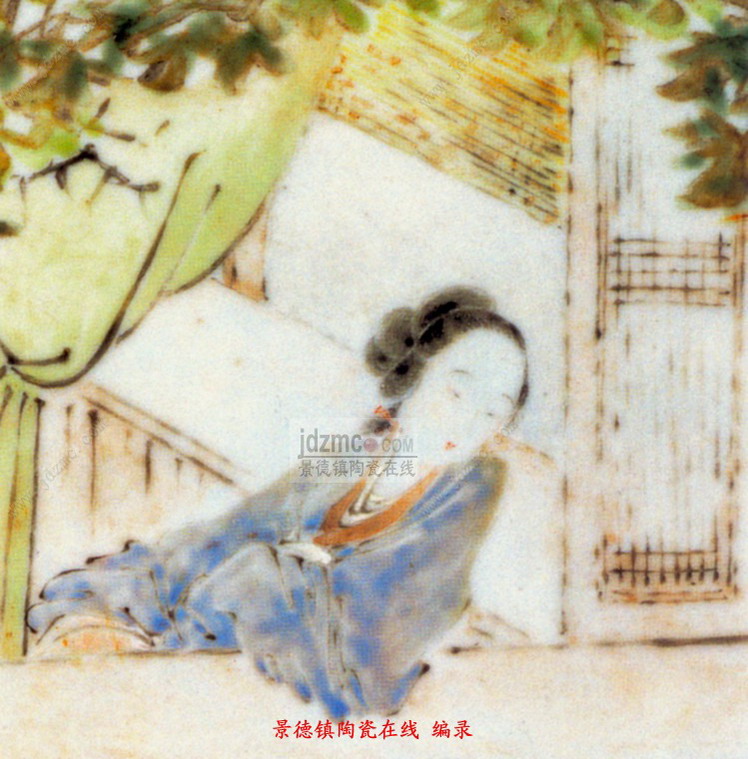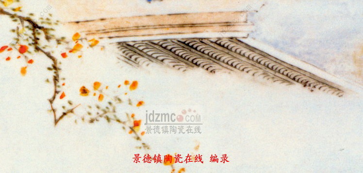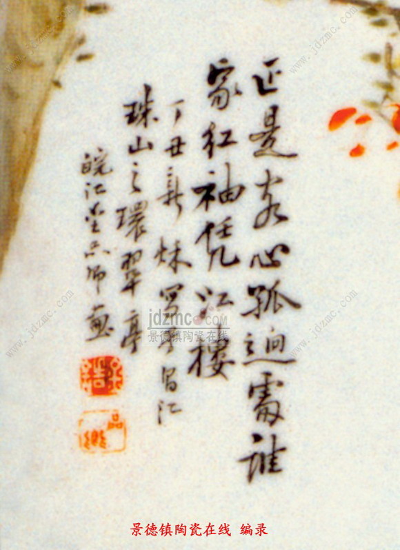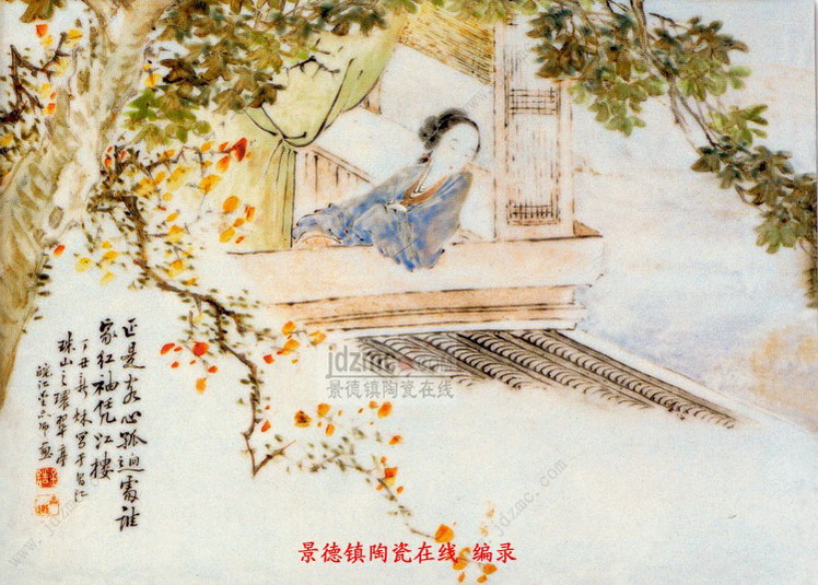 画上题诗:“正是客心孤迥处,谁家红袖凭江楼。”落款为:“丁丑新秋写于昌江珠山之环翠亭。皖江金品卿画。”印章二枚,“金诰”、“品卿”四字。丁丑年即清光绪三年(1877年)。据考环翠亭在当时景德镇御窑厂内。