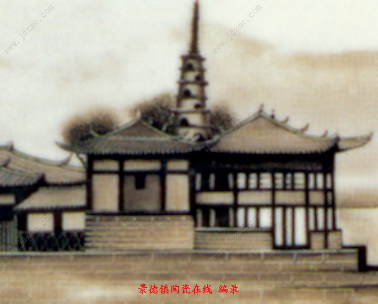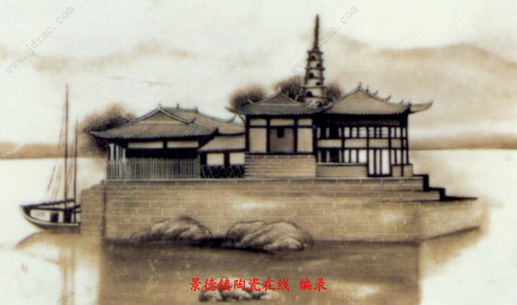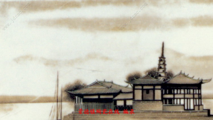画面绘福建金山塔,构图平正,屋宇和金山塔居画面中间,波平云淡。作者以炭精擦笔画法表现。擦笔画是瓷上肖像画的基本技法,可细腻地画出复杂的形象和细节丰富的浓淡层次。邓碧珊早年画瓷像,所画建筑风景瓷板画多以瓷像画法表现,画风独特,特点明显。