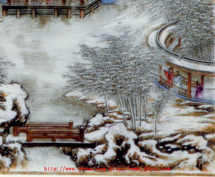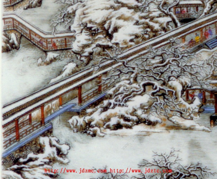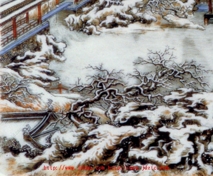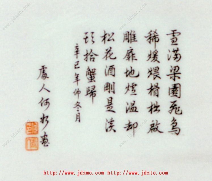 粉彩梁园飞雪图瓷板何处人长38.5厘米、宽25厘米题款:“雪满梁园飞鸟稀,暖煨猾拙启雕扉。地炉温却松花酒,刚是溪头拾蟹归。辛巳(1941)年仲冬月,处人何如画。”印章:“何印,处人”。景德镇陶瓷馆馆藏资料 真实可信