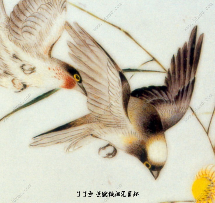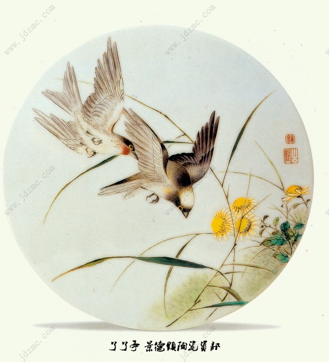 此圆形瓷板画以精细之笔描绘一对乳燕戏飞干秋菊和芦苇中。前面乳燕俯视展翅低飞,随后一只侧飞斜冲而下,一正一侧,极含自然情趣。鸟的背羽、颈羽以褐彩精工染擦,腹羽。尾羽、翅羽内侧以单线双勾,淡染褐彩,画工精细。画面的右下方绘数朵黄菊,两枝苇杆,几片绿叶,秋天的信息尽显无遗。