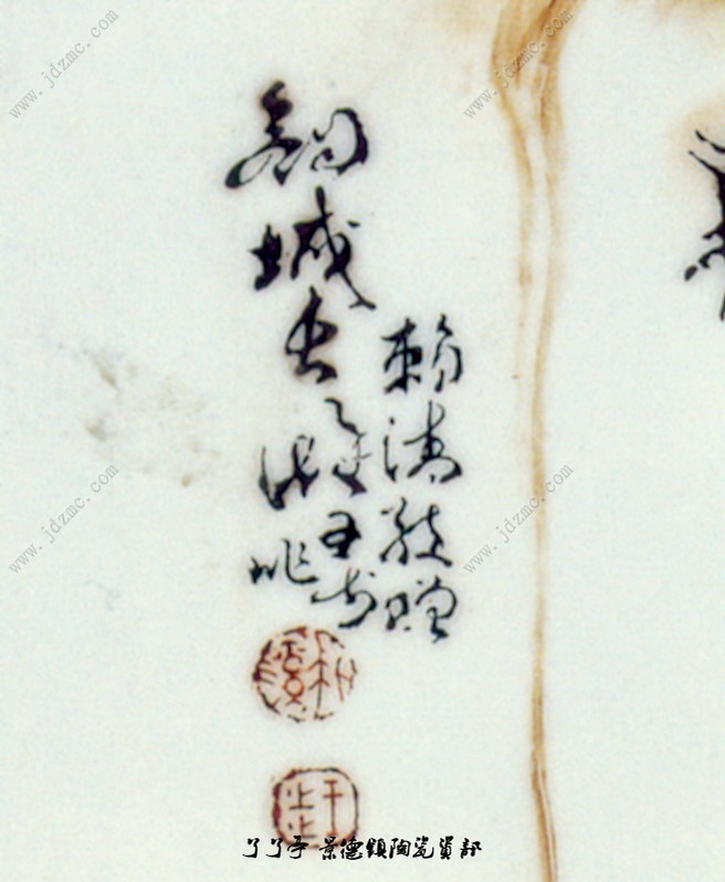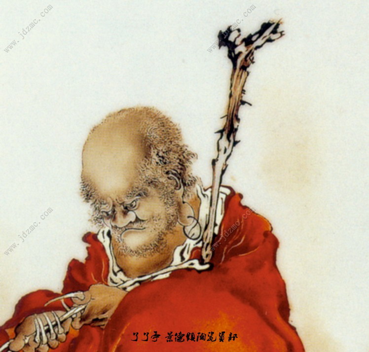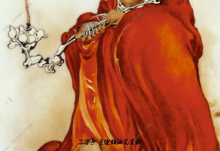 作品绘得仙罗汉,人物开相奇古,身着红袍,僧衣以没骨法表现,只拓抹,无勾勒,少复笔,但衣纹皱褶流畅准确,立体感强。得仙罗汉怀中拥有寿杖,双手握住奇异古怪的烟斗,手脚的描绘似兽爪。罗汉立于云气之上,气氛幻化,神秘莫测。粉彩装饰是王步的另一手高招,他以国画的笔意,极具工艺材质的表现手法,把得仙罗汉的形貌神情刻画得细腻精妙。