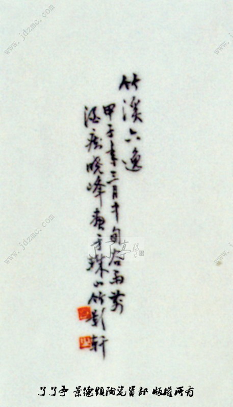 画上题云:“竹溪六逸。甲子年三月中旬谷雨前,酒痴晓峰画于珠山竹影轩。”此图为熊氏1984年作。