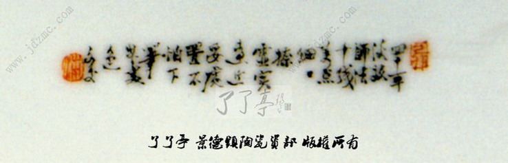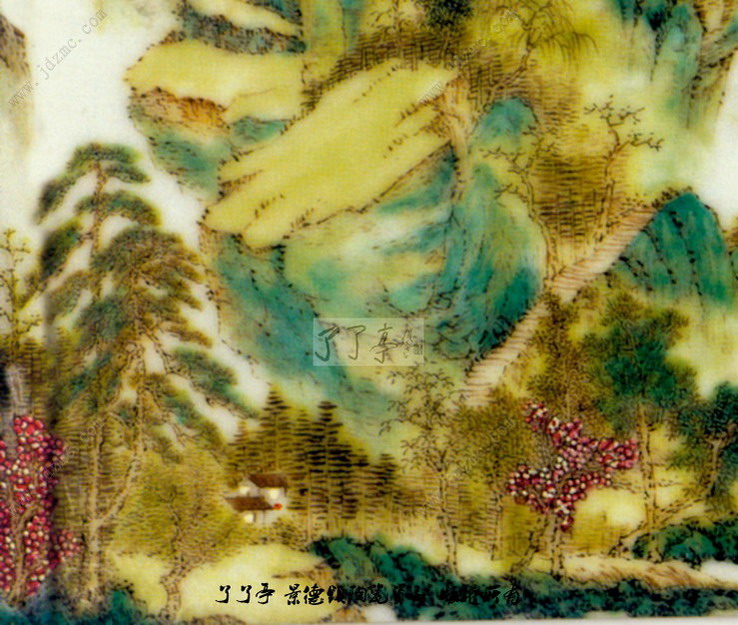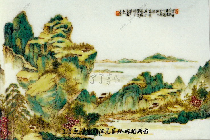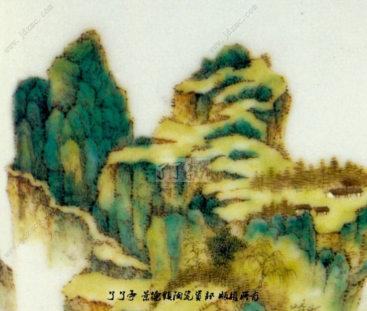 画面左边的山峰层层叠叠,参差错落,山径迂回,拾级而上,给群山增添了不少灵动。山峰以墨彩皴擦出明暗厚实,深暗部染以淡青色,明亮处渲染草淡绿。山脚下古树婆娑,一片茂密。村舍栋栋散落干江岸滩涂,显示自然天成之美。画幅右边的远山淡淡勾点几笔,亦显深远之意境,湖面宽阔,明亮幽静。整幅画面构图严谨,疏密得法,用笔细微,景致幽中显雅,秀丽清新,具清初“四王”之画风,又有景德镇瓷画家张志汤的风格。