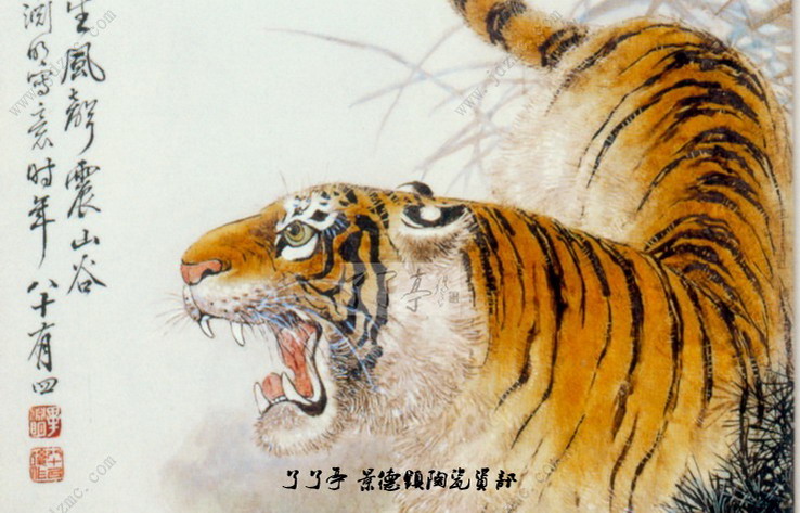 画面构图严谨,动静相衬。虎的神威表现得淋漓尽致,尤其是威在眼神,目光炯炯,虎视眈眈。虎的形象结构准确,动态和气韵生动,仿佛听到山震地摇之吼声。运笔苍劲,实处刻画入微,虚处芦苇叠影,出落潇洒,深山雾气朦胧神秘。作品染色秀丽,层次变化尽在虚实浓淡之中。