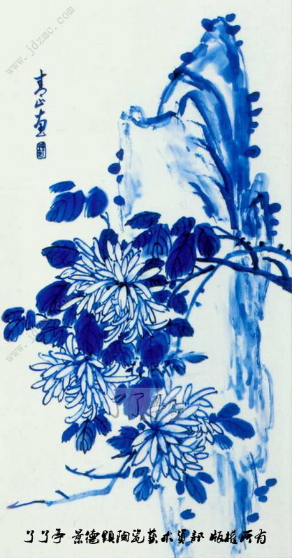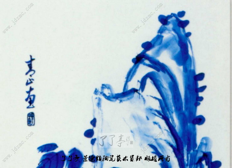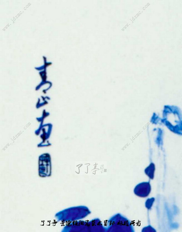 画面以青花单色描绘,浓淡墨色讲究变化,色调丰富,水晕墨彰,作者对青花料的运用,较好地发挥其质,把握其妙。