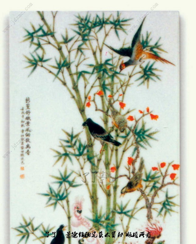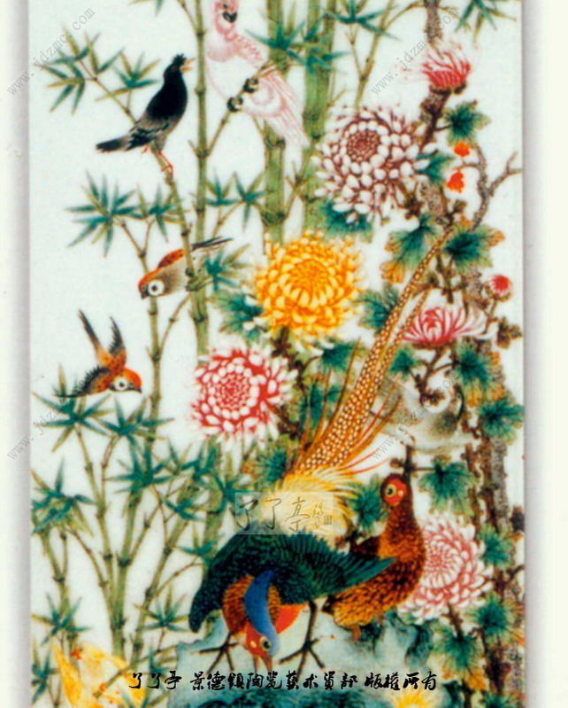 《百鸟图》由四块三尺六寸条形瓷板组成,春夏秋冬皆备。春有国色天香的牡丹,夏有亭亭玉立的荷花,秋有傲霜吐艳的金菊,冬有铁骨铮铮的红梅。画中间以名花异草,并根据不同的节令饰以锦翎水禽,使之相 得益彰,呈现出 “风鸣婉转百鸟和,百花吐艳尽芳香”的妙景。整个画面节奏活泼,气韵生动,兼工带写的手法,随物而异,以形传神,表现出物象的神采及质感。