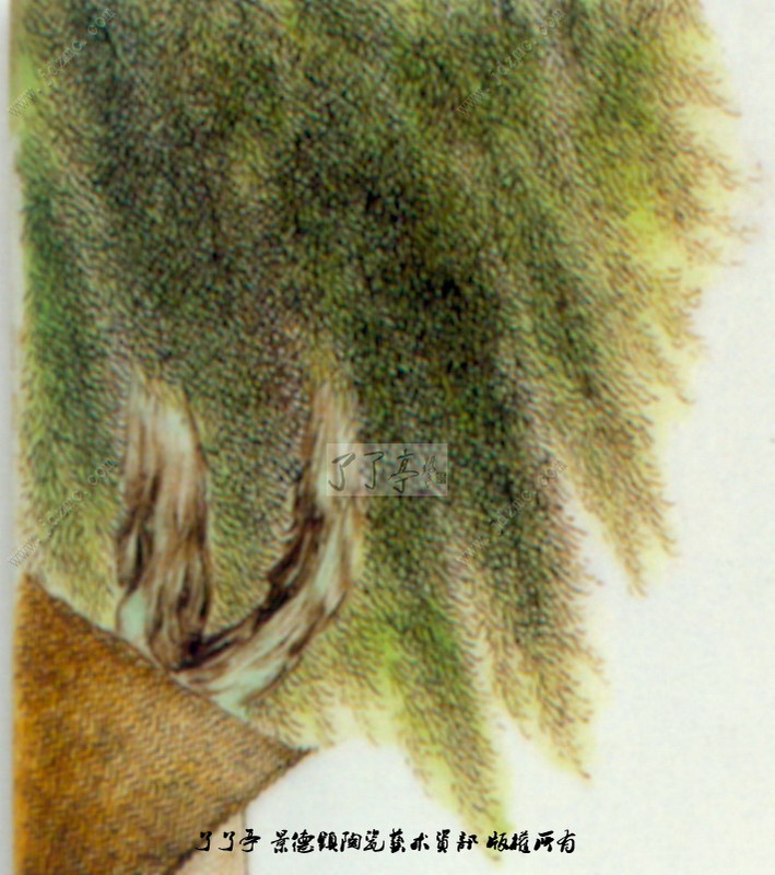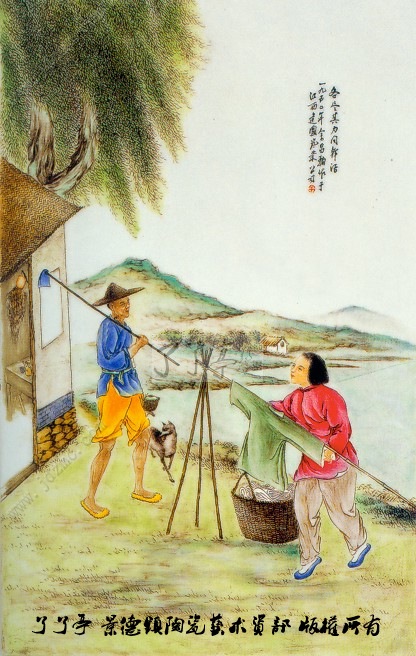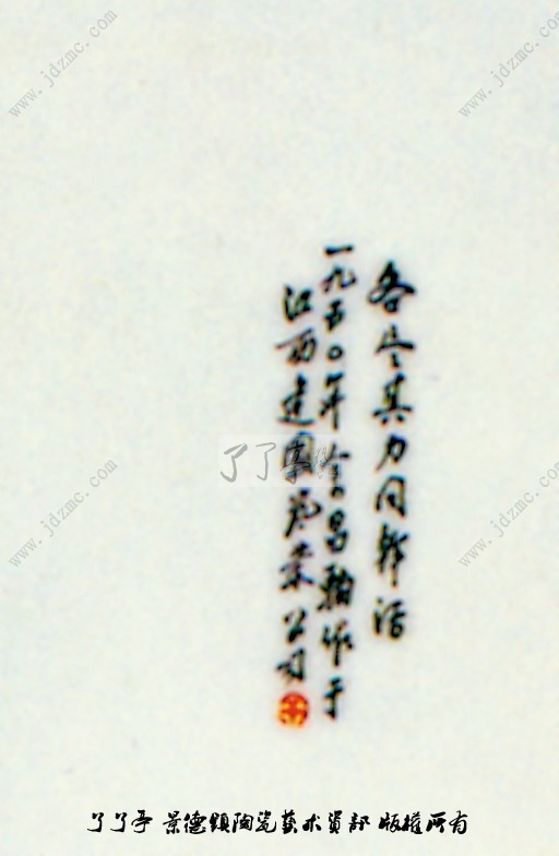瓷画右侧上部题款:“各尽其力同干活。一九五0年余昌驹作干江西建国瓷业公司。”款下钤“余”字章。书法俊秀,运笔潇洒。 (罗晓涛)