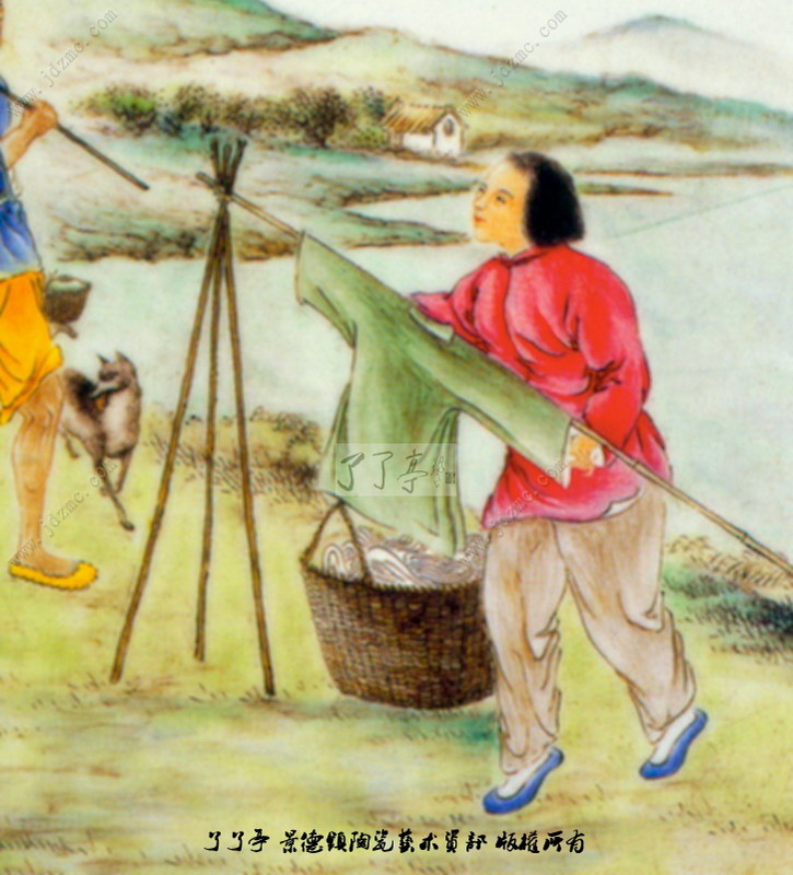 高38.5厘米宽24. 7厘米作者描绘建国初期农村和睦小家庭生活瞬间的情年轻的女主人正将衣服晾在竹竿上。头戴斗笠,衔穿草鞋、裤管卷起的男主人肩扛铁锄下地干活。一只花狗摇头摆尾紧随其旁。画面的配景是河塘、远山、农舍、柳条,表现出农村环境清新的自然景象,散发出建国初期浓厚的乡村气息。画面布局空旷;情与景相呼应,手法写实,运笔秀逸,色彩清新,具有强烈的时代特征。