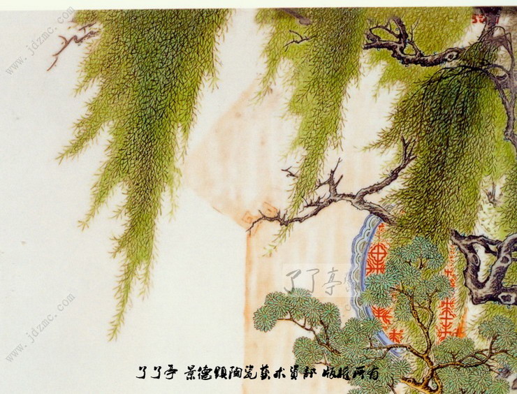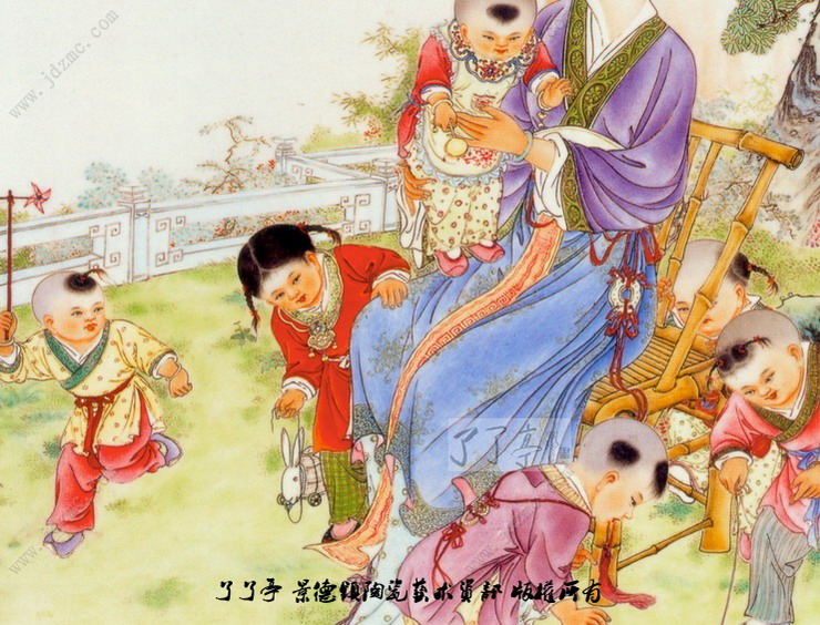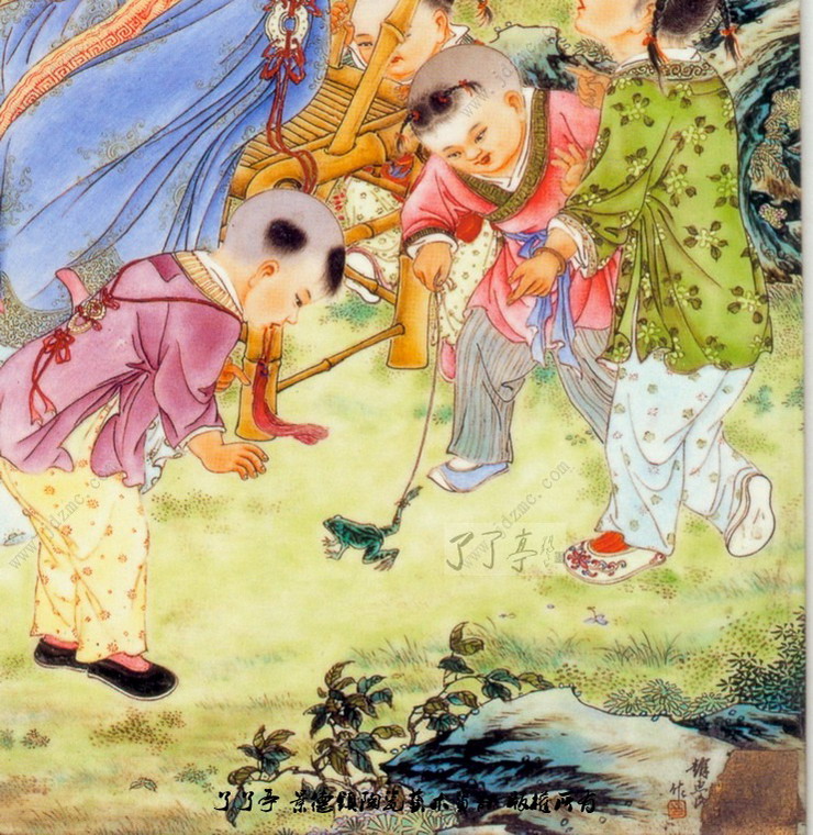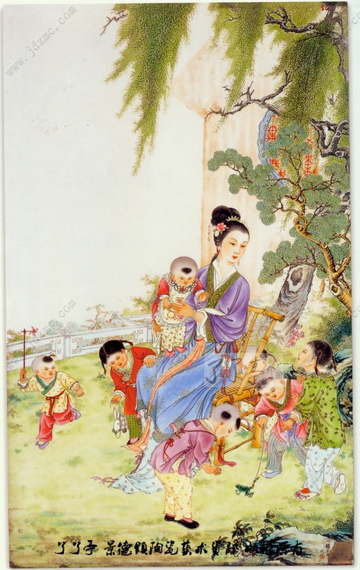 画面描绘庭院内的柳阴下,一群活泼可爱、形象生动的小孩围着慈祥温柔的母亲嬉戏玩耍的景情。小孩天真烂漫,有的举着风车,有的牵着青蛙,有的拖着玉兔,人物各具动态,情景交融,互相呼应。母亲形象端庄,体态秀美,作者以优美的自然环境烘托母亲贤淑善良的特征,人物刻画细腻,生动传神。背景树木勾描手法并用,填色精细,粉润而柔和,整幅作品色彩丰富,艳而不俗,粉彩技法娴熟,是表现母爱题材的粉彩瓷板画精品。