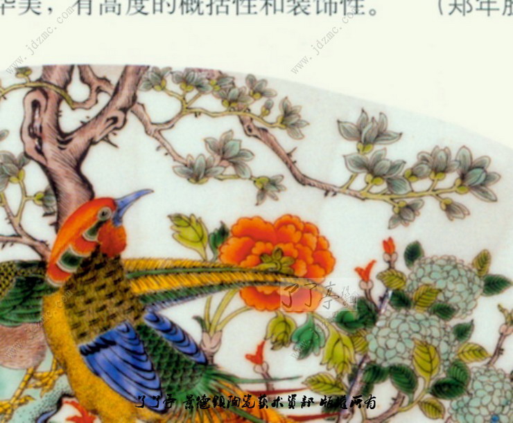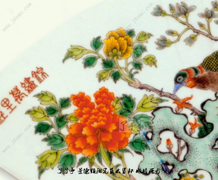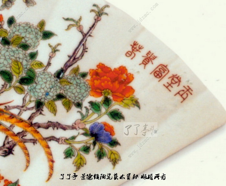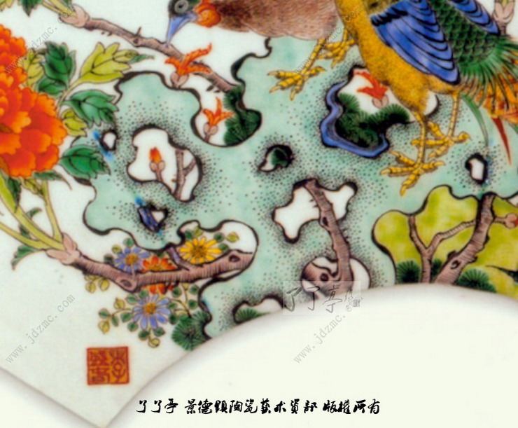 瓷板为扇形,板面有仿扇页折痕,这种瓷板极为少见。作者以五彩绘锦鸡、秀石,牡丹.玉兰及绣球花。构图疏朗而又充盈,山石与锦鸣交织在一起,相互呼应,形成动静对应。锦鸡刻画细腻,于严谨规整中显现灵动和生机。秀石玲珑剔透,牡丹勾填并用,线条劲挺有力,刚中有柔。色彩明快热烈,具有强烈的装饰性和民间艺术风味。
