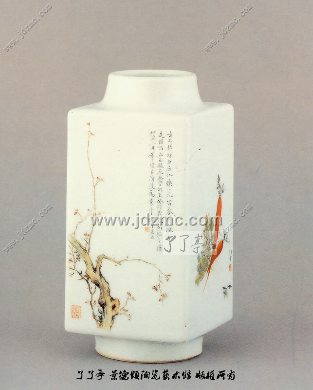 潘甸宇(约1887-1926)彩绘人物瓜果花卉图方瓷瓶1920高:20.1厘米(1/题款:『古木槎伢,曲屈化镇,一花皆舂,孤山风雪。是幅乃五百梅花贪主所作,癸卯岁见而临之,藉知前人用笔皆以简淡为贵耳。匐宇画并题。』 印章款: 『钧』』故人千里外』题款: 『钧画』 印章款: 『匐』题款: 『庚申冬月,占番匈宇画于古欢斋。 印章款: 『匈』题款: 『为此春酒,以介眉寿。古欢斋主笔。 印章款: 『潘』『多寿』 底款: 『古欢』