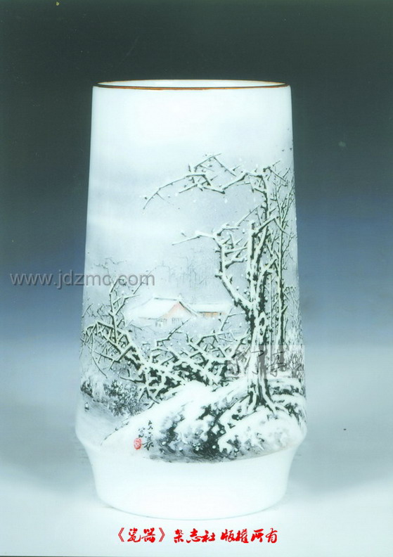 (名石谷)的披麻皴山石构图取意对何许人的事业上的进程有较大影响,就其树枝穿插走向,行笔设色,跟当时纸(或绢)上的图画丹青有着截然不同的工艺性差别。他将我国的传统国画风格,有机地融合了瓷上绘画的特性,从面形成了自己的独特绘画格调及个性鲜明的艺术风貌,在陶瓷绘画的雪景课题上,开创了一代新风,乃是当之无愧的陶瓷雪景画的风云领袖,直至今日,乃不失为最具影响的一代宗师。
