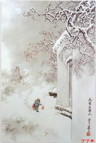 世人观先生的雪景图,从中感悟意境,曾有人赞曰:自古雪景多以奇险取胜,先生则以平易亲切见长,笔下画面无哗众取宠之意,而是充满天真、淳朴、庄重的意境。一幅画、一首诗。形物从心,冰雪固然凄凉惨淡,然而寒雪之夜的老人幼子,灯笼的朦朦之光,动静呼应,又有冷暖对比,尺幅之间的那片天地,充满温情,点醒了整个画面。