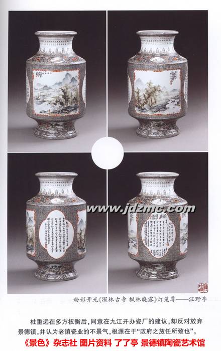 有一定内在修养的绘瓷画师在绘制浅绛彩瓷器时打破旧时瓷绘分工过细的套路从设计图稿、填涂勾画直至题书印章皆一人完成且在创作时运用诗书画印等诸要素,it景德镇陶瓷悄然从“匠器”向文人瓷方向发展。