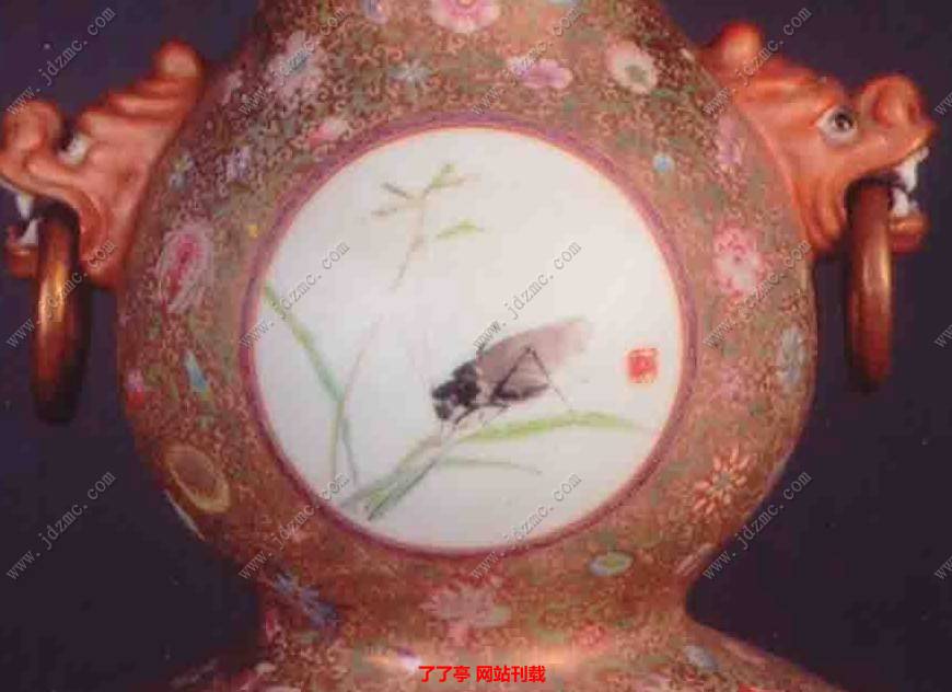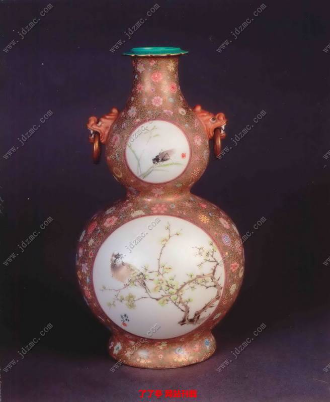 近代景德镇艺术陶瓷拾遗补缺(金地粉彩开光花鸟兽耳葫芦瓶 高38.5cm口径6cm)
