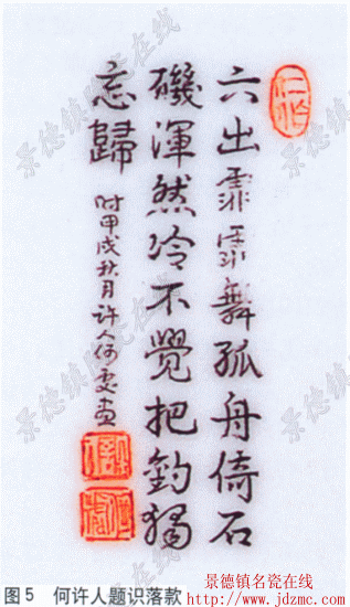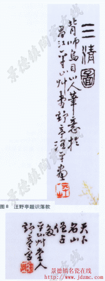 �������Ϊ�������˺δ��������ֿʹΡ��������˺δ���������������˺δ��������֡���(ͼ5)�� ����ӡ��Ϊ�������ˡ������δ����������˳�Ʒ���ȡ� �����ɻ����� ����Ϊ����ɽ���ѡ�֮�ף�����1884�꣬����1937�꣬����53�ꡣ�����������Ϊ��������˱�ɺѧ���ɰ�Ф������Ǯ�۰���Ů��Ϊ���������ѧ�����ݰ˹֡�֮һ�Ļ������������Ʒ��ʼ����Ǯ�۰��ͻ�����Ӱ�ӣ��ڼ̳��������Լ�����������д�����ﻭ������ ��ī(��)���� �� ��������֮���϶࣬��Ҫ�����ﻭ��1928����ǰ�������ﻭ�ķ�ò�п��Կ���ѧǮ�۰���Ӱ�ӣ�����ѧ�����ı�ī��������������ǰ�����γ��Լ��ķ�������������������ŵ������ƷҲ�Դ���Ϊ�ࡣ���������ﻭ�ı�ī�ص���������Ҫ�����¼����ص㣺 һ�����������ﻭ��Ǭ¡�۲ʵĻ����ϣ�����Լ����껭����ļ��գ�����������������ͷ���̻�ϸ�壬�������ַ��������������������ϵ���������鲶ȷ����Ӱ���ڱ仯��������滭��Ⱦ�����������ǿ����������Ϊ������ͷ�ӡ�����ģ�����������Լ���Ⱦ��ȱ��ϸ�壻���й�Ӱ�仯����������β��㣻����ȱ�����飬�������Ӳ�Ĵ���Ф�� �������������ﻭ�������ñ��������ٴ����������������ˣ��������ᣬ�������ң�������й���ͳ��������ݲ���֮�䣬�����ı������з��ñʣ��л�����ݵı��⣬��������������ȷ�������پ��������Ծ������Բ����뻭�ķŴ�����ȡ������з��ñʣ������Ŵ�������ɣ��Ȼ����������������ȣ�Ҳ�������������ڻ����Ļ������Գ�һ�������˱�����ȴ�ֽṹ��գ���������ȴ������ٴ졣��ģ��Ʒ������Ӳ���˱ʵĶٴ�̬֮�����������������������ң����ܽϺõ���������ṹ�� ���������ﻭ����ɫ����Ҳ�м����ص㣺һ��������Ʒ��ɫϸ�壬��Ⱦ��ηḻ���д�����仯�����Ǽ�ע��ɫ�ʵ���ů���䣬�ֲ���Ũ����������ã֮�У������Ըɱ�������������ۣ����Ⱦ����ηḻ�������õ�ʭ֮�������Ρ���ģ��Ʒ��ɫƽ�壬�������α仯���ر���Ⱦɫ֮��ĵ�ʭ֮�������������ζ��䣬ͽ����ʽ������Ҫ�졣����ģ��Ʒ(ͼ6)������������Ʒ�漣�Ա�(�μ�����157ҳ��237ҳ��Ʒ)�����ϼ���һ����֪�� �����ڼ���������Ʒʱ�������鷨�ı�ī�ص����֣�Ҳ��ʮ�ֹؼ��ġ������Բ����⻭�����˷����ǿ������û�����˴�������������鷨�Ǽ���������Ʒ����Ҫ����֮һ�����������Ϸ�Ʒ��������ȥģ�����鷨���еķ�Ʒ���ܸ�����ġ��ö������鷨������������ִ���Ʒ��ע���鷨��ģ�£�����ר����д��������֮�ˣ�������ϸ��Ҳֻ�����Σ�������ǡ� ��ʶӡ�� ����������Ʒ�ٳ�ƪ����ʱ����ͼ�¡��������Ʒ���ϳ������Բ�����ǣ��鷨������£��Ծ��ݺᣬɢ�������˹��ڽ���������֮��������硣���һ�㶼����дһ����ʫ�ĺ������֧����� �������Ϊ�����������Ե�������д������������������д����ɽ��������������ɢ������д����ɽ����ի�������������Ե�������д����ɽ�ʹΡ��ȡ����������ʱ���Գơ�����ɢ�ˡ���ʱ���Գơ����Ե��ˡ������߷DZ��� ����ӡ��Ϊ���������������������ԡ��������Ի�ӡ����������ի���������䡱����������ӡ���ȡ� ������������� �ִ�����Ʒ�У�ż�����ֻ滭���ī�ص㡢��ʶӡ��������ʮ������ȴ��������������Ʒ����(ͼ7)����ҹ����������