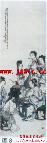 王大凡以画瓷上仕女、文人著称(图7),如果与徐燕荪的仕女画相比较(图8),也只能说各有千秋。张大干、傅抱石所画仕女,虽然远追唐、宋,很有渊源,但人物画的审美判断准则,毕竟是以造型的生动,传神的深入、线条的变化、笔墨的精妙等形式规律为判断依据。所谓“高古”与否?“渊源出处”如何?只能说明一个“博”字,而艺却在“精”字上。就此而论王大凡的瓷上人物画,不会在这些国画家之下。王琦、王大凡的人物画,在中国美术的艺坛上该有一席之地。
