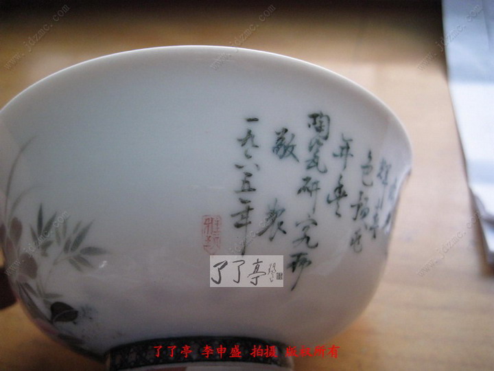 这个是陶研所的一个市面上流转作品,釉中彩花鸟画,1965年制。因为这种碗看的不多,手头上资料缺失,断代和鉴定笔者拿不准,所以这篇文章提供相关图片资料仅供大家参考和借鉴。笔者这一段时间在组织一批近代资料用以丰富收藏者鉴定的网络手册。