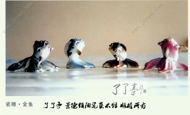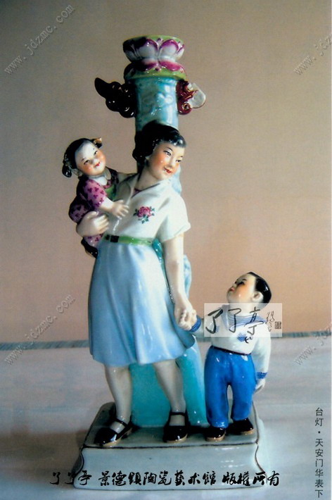 江西画报:我收藏有五组精美绝伦的小瓷雕,它们是: 一、 台灯·天安门华表下; 二、瓷盘·少女胸像; 三、瓷塑·汉、藏、维、哈少女坐像: 四、瓷塑·男、女娃娃立像; 五、瓷塑·金鱼 除天安门华表下和少女胸像为单件外,其余都是每套四件,加起来共14件。 这14件东西,我和妻子赏玩了四十余年,至今仍爱若拱壁, 有以下几个原因: 一、 它们都出自名家之手。《天安门华表下》是老一辈雕塑家曾龙异的作品, 其余四套作品的作者虽然难以具体指认,但有几点是可以断定的; 其一, 它们都是60年代初期部陶瓷研究所的产品, 而其时部陶研所正是瓷塑名家济济一堂的黄金时期, 曾龙异(陶瓷艺术家, 已故),周国祯(陶瓷学院教授)王雪如(陶瓷美术家),康家钟(陶瓷美术家, 已故), 张育贤(曾龙升传人, 中国工艺美术大师)等当时都在部陶研所工作,这几套作品的雕塑成型为其中某人所为当无可疑。正是因此, 它们的造型是那样栩栩如生,活泼灵动。其二、三组瓷雕都是我岳父章锚(陶研所艺术室主任, 陶瓷美术家)亲笔加彩,所以, 它们的色彩是那样丰富而协调, 把人物的时代, 民族,性别,年龄特征和金鱼品种间的差异反映得那样鲜明而突出。 二、三套瓷塑是我妻子闺中清玩佳品,瓷盘《少女胸像》是妻子赠我之定情物,而台灯《天安门华表下》是曾龙异送给我俩的结婚礼品。记得当时曾龙升送了两个台灯, 除《天安门华表下》,还有一件古代仕女台灯。我把后者送给了其时也即将成婚的我的妹子, 而留下《天安门华表下》, 因为它在天安门华表下塑造了一位短袖蓝裙的少妇,左手牵着一位身穿海军服的小男孩,右手抱着一位活泼伶俐的漂亮女娃,正好反映了我妻子对家庭生活的美好愿望:她也想要两个孩子,一男一女,黄昏后带着他们在天安门华表下散步,观赏祖国首都的壮丽景色。这个愿望后来实现了, 我们有了两个孩子, 但都是男孩,而且孩子小时候正逢文革期间,没条件带着他们去天安门散步,这不能不说是遗,憾!但无论怎样,这几套东西,都见证着妻子的少女时代及我们的婚姻历程,它们不是一般的艺术品!何况,从三组瓷塑身上,我们还能看见岳父大人的手迹呢! 四十余年一眨眼过去了,我和妻子已成了年逾六十的老人,可我们钟爱的小瓷雕,除台灯略有损伤,其余仍然熠熠生辉,一如当年。这恐怕也是陶瓷艺术品的一大魅力吧!