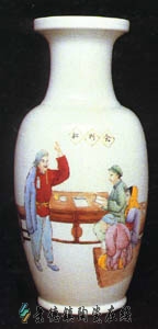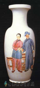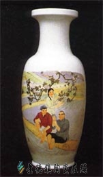 名称:白釉彩绘江青排练样板戏 瓷板 规格:H60cm 款识:中国景德镇制 一九六七年十二月 1. White Glazed Porcelain Vase with Decoration of Jiang Qing Rehearsing Model Drama |