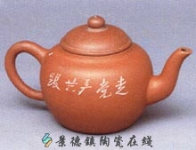 名称:跟共产党走紫砂瓷壶 规格:H11cm 内容:听毛主席话!跟共产党走 Redware Jar with Painting of Following the Communist Party of China |