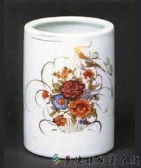 名称:青花增产节约瓷笔筒 规格:H12cm Porcelain Brush Holder in Underglaze Blue with Painting of Increasing Production and Practicing Thrift |
