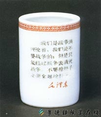 名称:白釉毛主席语录瓷笔筒 规格:H11.5cm 内容:你们不要老要游泳池里练 White Glazed Porcelain Brush Holder with Painting of Quotations of Chairman Mao |