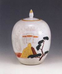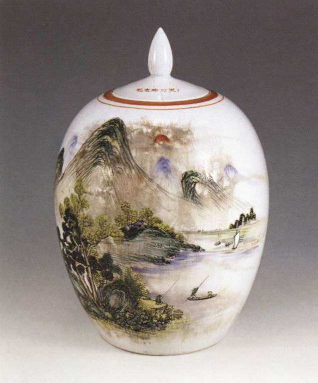 山水风景图彩绘瓷罐