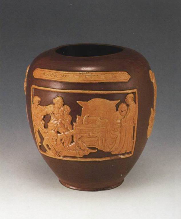 《红色娘子军》浮雕人物像黄釉褐花陶罐