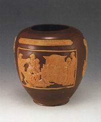 地主收租褐色釉黄花陶罐