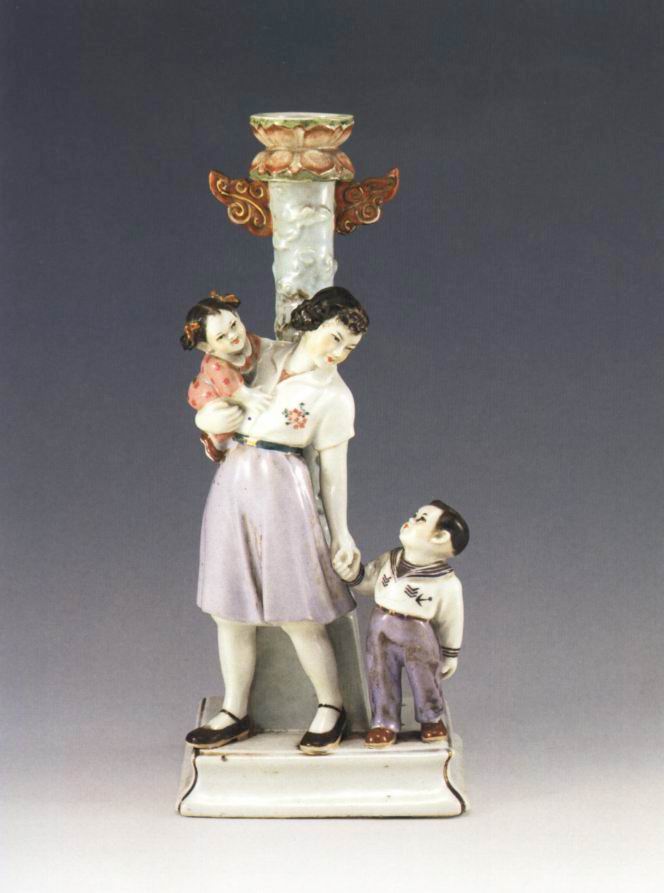 华表下的阿姨与儿童彩绘瓷灯座 |