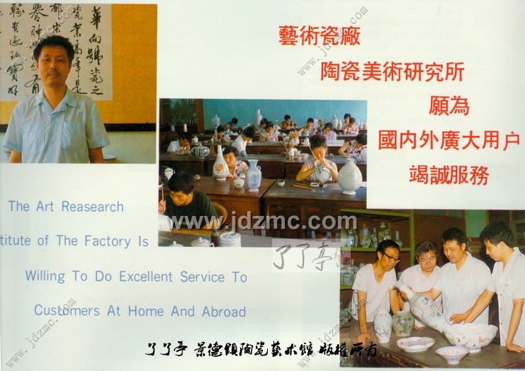 景德镇艺术瓷厂美术研究所,成立30余年,在国内外有着很高的声誉,是以研究和制作高档粉彩资为主的陶瓷科研机构,拥有雄厚的高超技术力量。几十年来有高级职称的技艺人员20人,中级技艺人员30人,初级技艺人员50余人,为发展高档艺术瓷、礼品瓷、展览瓷,马培养高精英专业技艺人员作出了一定的成绩。 该所能设计制作各类高档粉彩瓷、瓷板画、古彩瓷、墨彩瓷及各类薄胎瓷产品和高档仿古瓷,产品畅销世界100多个国家和地区,深受外商。收藏家的欢迎。 所长:扎沛文(工艺美术师)
