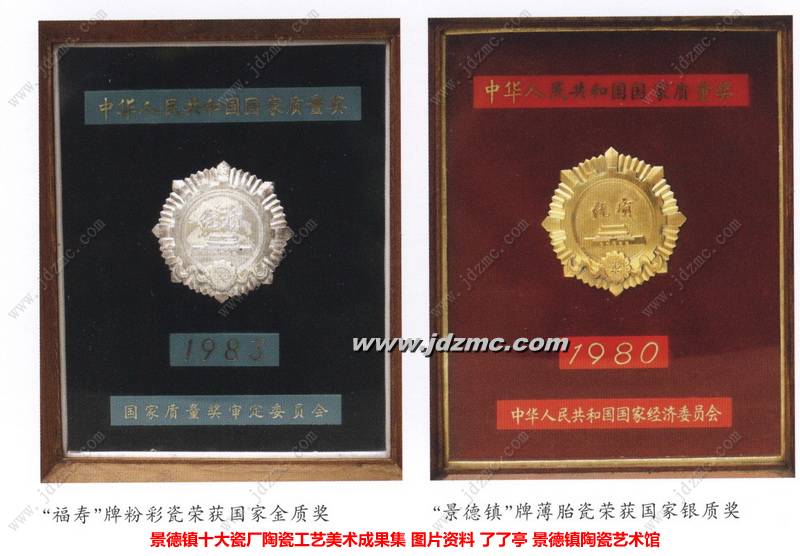 这个时期是艺术瓷厂获得表彰和奖励最多的年代,最突出的奖项有国家金质奖、国家银质奖;“百花奖”金杯奖、银杯奖;北京国际博览会金奖;轻工部质量管理奖以及省部级以上的各种奖励多达四十余项。艺术瓷厂“福寿牌”商标和“景德镇牌”商标均加入国家级注册商标行列。