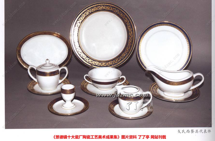 戈氏西餐具在造型上综合了景德镇名瓷的主要特点,如其中的双耳杯,就是在富有代表性的古瓷佳品——正德器的基础上改进而来,可谓古风犹存,不乏新意。图案装饰以孔雀蓝为底,配以菊花图案,再描之以金边,庄重大方,富丽堂皇,既符合俄罗斯民族文化传统,又适合国宾馆的装饰要求,装饰手法用腐蚀效果,所描的金边既达到一定的厚度,在灯光下又不刺眼,适合于皇家、殿堂用膳。