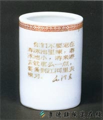 “文革”抄家中破除“四书”大概是砸了许多笔筒。“文革”期间瓷厂生产笔筒想必与大批判写大字报有关,当时人人都挥毫上阵,口诛笔伐,不少人还因此而成就为书法家。当然,瓷厂生产笔筒也有忌讳。“文革”本就是革文化的命,笔筒超出了口诛笔伐的应用,必定惹火烧身。 樊建川收藏的笔筒不多,花色品种也异常单调。这些笔筒大多出自云南永胜瓷厂。永胜乃滇西北偏僻小县,在当时的情况下,其产品能远销四川,应算是很会做生意的。 “文革”期间,知识一钱不值,知识分子被打入黑九类。全社会的风气不是读书,而是崇尚造反精神,不学ABC照样爱中国等等。当时有个小学生,以其反“师道尊严”而闻名全国。另一位“知青”亦因其被“推荐高考”时交了白卷而成为叛逆英雄。一九七七年恢复高考制度以前的中学生即是在这样的氛围中读书,又有免考入大学的“工农兵学员”作他们的榜样,笔筒确实成了一件嫌疑多多的器物,难怪其稀少。“文革”笔筒即使花色、造型单调,却是不可多得的文物,能搜集到已是万幸。