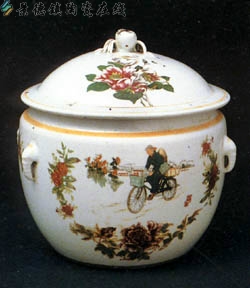 “文革” 罈罐最具世俗生活气息,它们大部分都出自四川。自古以来,战乱灾祸似乎都未曾太为难四川,尤其是成都平原的休闲气氛更是名符其实的“天府”氛围。“文革”中生产的大量的罈正好印证,即使如此极端的运动,仍未削弱老百姓精心经营小日子的趣味,只不过在这些趣味的表面覆盖上一层政治彩罢了。 《打倒“苏修”罈》、《“九大”万岁罈》、《四川很有希望罈》等,用于盛放红糖、炒瓜子、绿豆、黄豆等食品,主要功能是防虫蛀鼠咬,还能防潮。由于是基层中小陶瓷厂所生产,这些罈的造型很显示出古朴的风格,纹饰活泼,流畅而朴实,图案与政治语境浑然一休,实用性极强,生活气息浓厚。 比之其它生活用品,“文革”瓷器中的瓷罐类大概是最讲究的类群。大部分为细瓷,又多是手工绘制,造型比较讲究,线条变化生动。 在当时,瓷罐基本上是奢侈品,高收入者方有能力享用,而一般收入者亦在人生重大喜庆时刻购买来作为隆重纪念。许多罐上除了政治话语外,还彩绘出“双喜”,即为明证。当时国营企业的一个新进厂的学徒工,月薪不过十八元左右。工作一两年成为正式工人,月薪亦不过二十几元。而一对带红双喜的瓷罐,价格为六至十元一对,自然是很贵重的物品,常常用于自己的婚礼或祝贺亲朋好友的结婚。